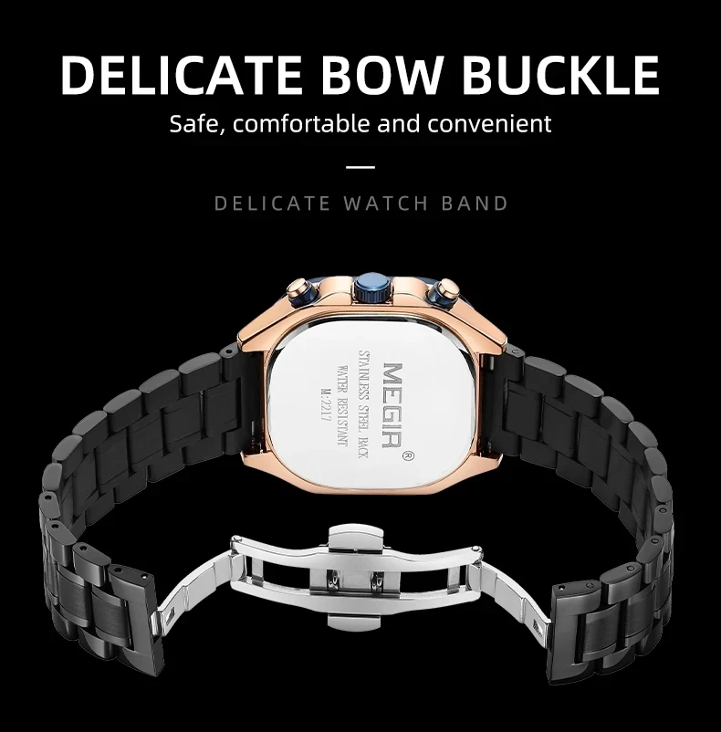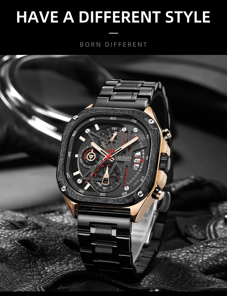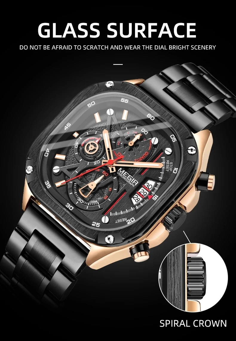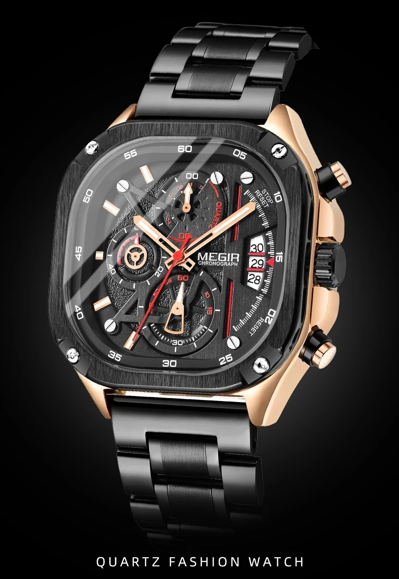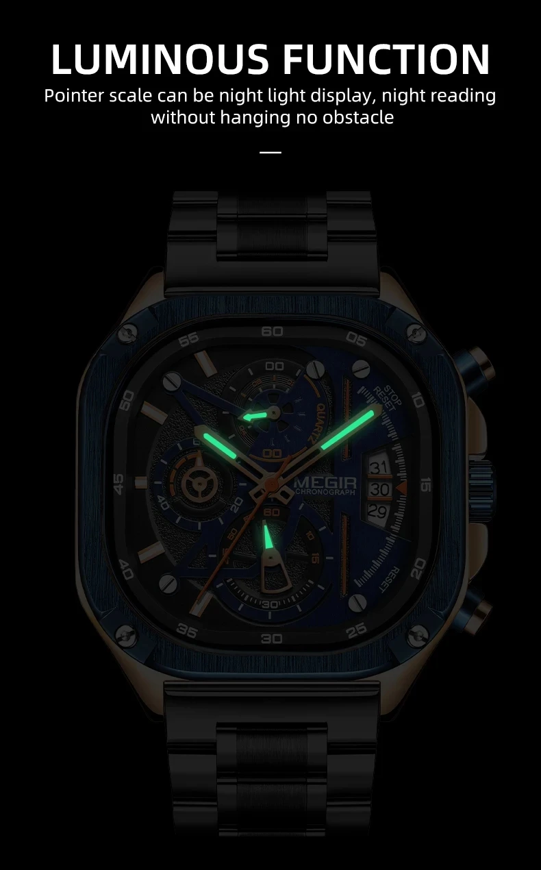 MEGIR Watches for Men Quartz Square Steel Band Butterfly Buckle Luminous Waterproof Multifunctional Mens Watch Reloj Hombre Relogios Masculino